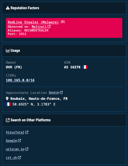 - A list of indicators (domains, IPs, URLs) in defanged or raw format