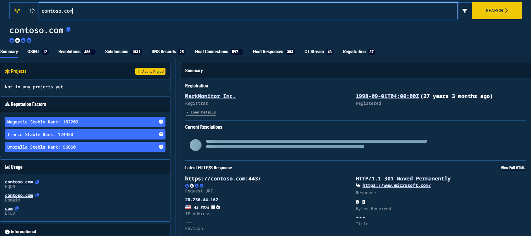 NoteNot all tabs are available for all inputs. For example, IP address searches do not return Certificate Transparency data, while domain searches do.