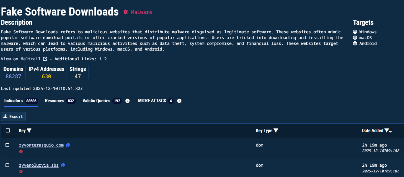 Use the Export control (above the Indicators table) to download IOCs as a JSON or CSV for: