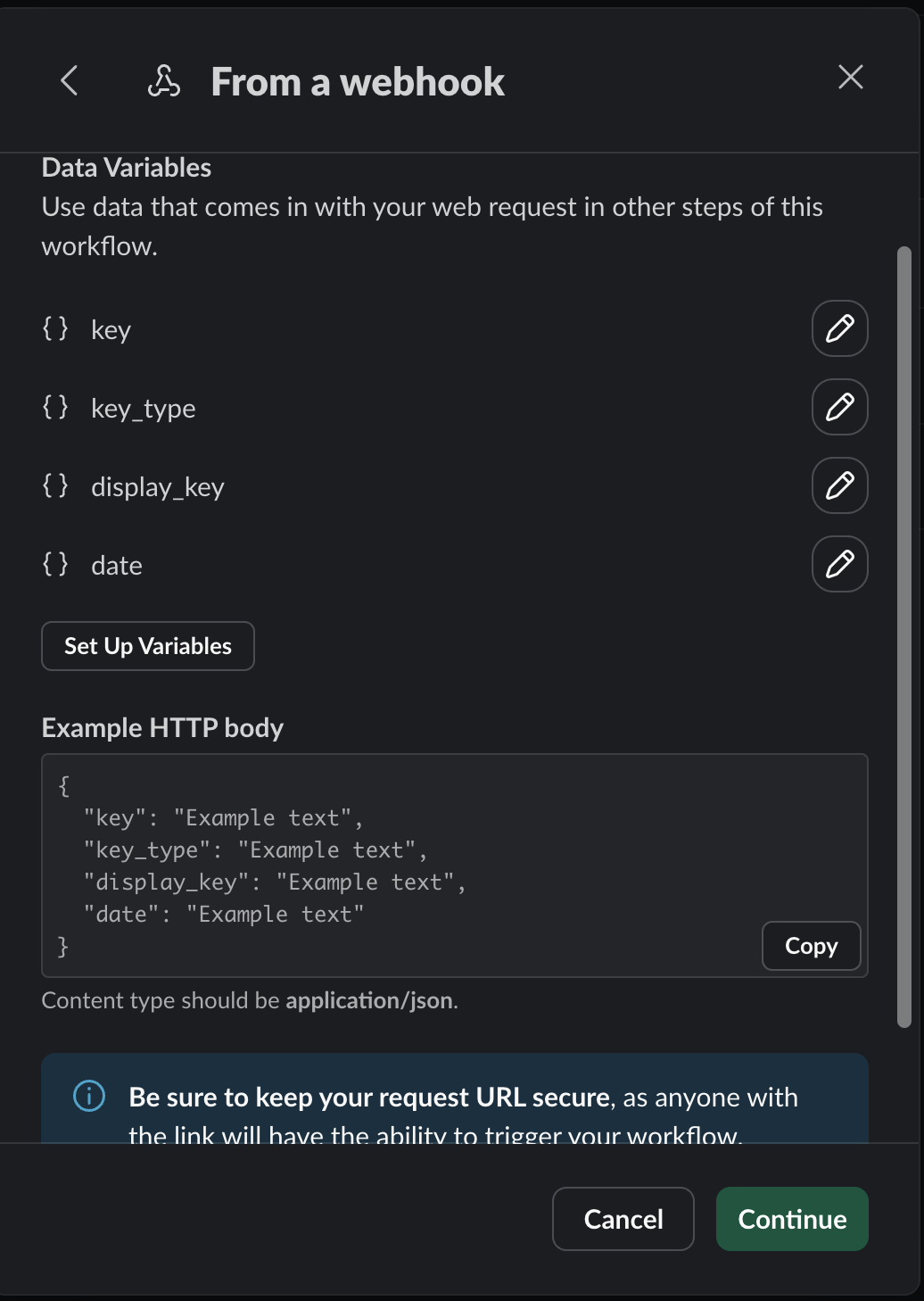 - In the From a webhook popup, click Set Up Variables and configure the variables accordingly, based on the data source you're configuring webhooks for and the fields that Validin supports. You can find a list of fields here